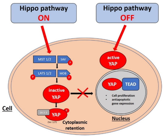 Hippo signaling pathway cascade relies on the activation of its downstream target, YAP. Phosphorylation cascade mediated via MST1/2 and LATS1/2 results in YAP phosphorylation and cytoplasmic retention thus preventing its nuclear translocation. When the Hippo pathway is “off”, the YAP is transferred into the cell nucleus and binds with the TEAD starting the transcription of antiapoptotic and survival-promoting genes.