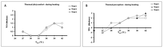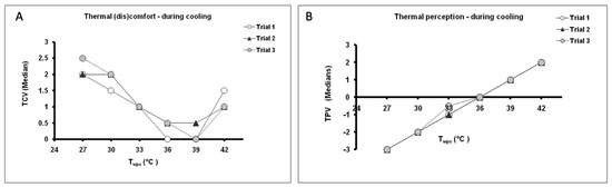 Subjects were requested to rate their perception of the temperature and thermal (dis)comfort at each 3 °C change in the Twps during heating and cooling in the range 27 to 42 °C. There were no significant differences between the median votes obtained from the three trials over the given range of temperatures. During the heating process, the lowest ratings of discomfort were reported at Twps = 30 °C and 33 °C (Figure 2A). These values were perceived as “neutral” and “slightly warm” (Figure 2B), respectively. Similarly, during cooling subjects felt most comfortable at Twps = 36 and 39 °C (Figure 3A), which also corresponded with perceptions of “neutral” and “slightly warm” (Figure 3B), respectively.