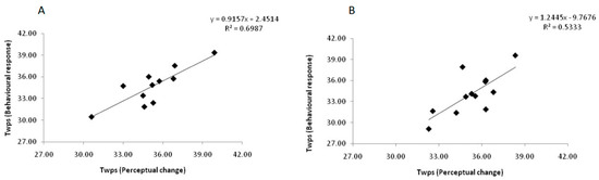 Correlation between the threshold Twps during warming (A) and cooling (B) at which discomfort was reported (Thermal comfort perception trial) and the threshold Twps at which a behavioral response to counteract discomfort was initiated (Thermal comfort regulation trial).