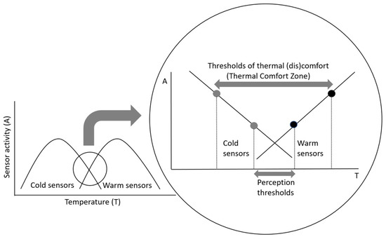 The activity of the cold and warm sensors in response to a steady state temperature stimulus. The region of overlapping, and thus equal activity of the sensors is likely the temperature of thermoneutrality. Decreasing and increasing temperature from this point of overlapping activity initiates increased activity of the sensors, which must reach a certain perception threshold for it to be perceived centrally. The grey and black dots represent the threshold for the perception of cold and warm (dis)comfort, and thus form the limits of the thermal comfort zone.