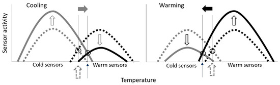 To understand the shift in the boundaries of TCZ it is necessary to appreciate that the thermoreceptors have static and dynamic responses, which are centrally integrated. As explained by Zotterman [48], the effect of cooling would be an additional increase in the firing rate of the cold and an additional decrease in the firing rate of the warm sensors (Figure 6, left panel), whereas warming would cause an additional increase in firing rate of the warm sensors and an additional decrease in the activity of the cold sensors (Figure 6, right panel). As shown in Figure 6 (left panel), cooling would thus result in a shift of the region of equal and overlapping activity of the cold and warm sensor to a higher temperature, whereas during heating (Figure 6, right panel) this region of equal and overlapping activity would be shifted towards lower temperatures. This would explain, to a degree, the differences regarding TCZ in the present study.