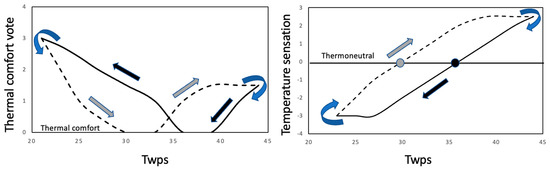 Illustration of the hypothesized hysteresis responses of the perception of thermal comfort (left panel) and temperature sensation (right panel) to heating (grey arrows) and cooling (black arrows) stimuli provided by the water perfused suit (WPS). The perception of thermal comfort (left panel, rating = 0) and thermoneutrality (right panel, rating = 0) occurred at higher temperatures of the water perfusing the WPS (Twps) during cooling (black lines and arrows) compared to heating (dashed lines and grey arrows).