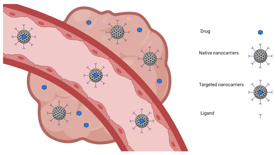 As exemplified in Figure 1, passive targeting is achieved when specific drugs, especially chemotherapeutic agents, are loaded into a native nanocarrier that passively reaches the solid tumor [61,62]. In the case of tumors, this type of targeting takes advantage of hyperpermeable cells and impaired lymphatic drainage [63]. Nanoparticles begin to accumulate inside the tumors due to their ineffective lymphatic drainage, and an important fact that should be taken into consideration, in this case, is that the size of the nanoparticles should be less than 200 nm, and their surface must be hydrophobic to prevent clearance by macrophages [64,65,66]. On the other hand, during active targeting, a particular drug is loaded into a native nanocarrier, and the nanocarrier system is loaded into a tissue-specific targeting ligand or a cell-specific targeting ligand [67,68]. In the active targeting, the nanocarriers’ surface can be modified with ligands that are recognized by the cell’s receptors. The content of the nanoparticles can be released in proximity to the target cell, attached to the membrane of the specific cell, or internalized in the cell [69,70].