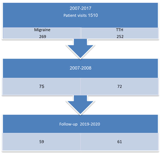 - Kienbacher, C.; Wöber, C.; Zesch, H.E. Clinical features, classification and prognosis of migraine and tension-type headache in children and adolescents: A long-term follow-up study. Cephalalgia 2006, 26, 820–830. [Google Scholar] [CrossRef] [PubMed]