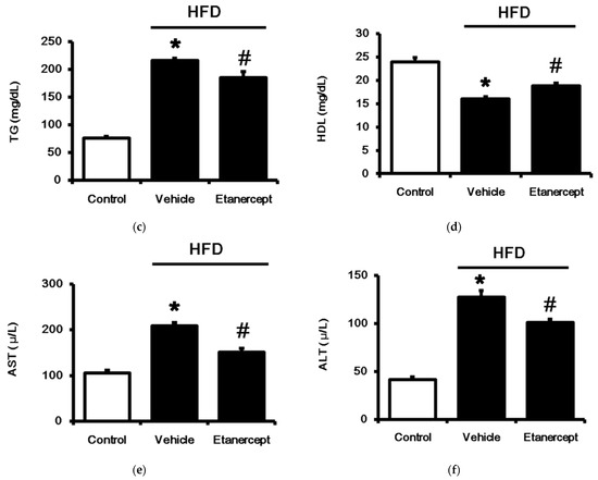Identification of metabolic syndrome (MetS) in rats fed a high-fat diet (HFD). The rats were divided into three groups: (i) rats fed normal chow (control); (ii) HFD-fed rats treated with vehicle (HFD); (iii) etanercept-treated rats that received HFD (HFD + etanercept). They were compared in terms of body weight (a), plasma lipids, including total cholesterol (b), triglyceride (c), and high-density lipoprotein (HDL)-cholesterol (d), in addition to hepatic indicators, such as aspartate aminotransferase (AST) (e) and alanine aminotransaminase (ALT) (f) in plasma. The results in each column are shown as the mean ± SEM (n = 8 per group). * p < 0.05 vs. the control group; # p < 0.05 vs. the HFD group.