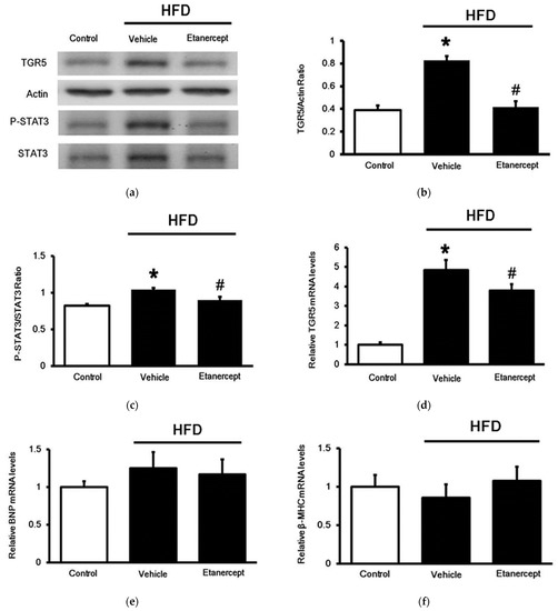 Expression of TGR5 in the hearts that were evaluated. The hearts were isolated from rats of three groups: (i) rats fed normal chow as control (control); (ii) HFD-fed rats treated with vehicle as the model control (vehicle); (iii) HFD-fed rats treated with etanercept (HFD + etanerceptf). Additionally, STAT3 activation was determined based on the ratio of STAT3 and p-STAT3. (a) The representative blot shows the protein levels of TGR5 and beta-actin, in addition to p-STAT3 and STAT3 in the heart tissues. (b) Quantification of the changes in TGR5 expression (TGR5 relative to beta-actin) and (c) STAT3 activation (p-STAT3 relative to STAT3) was also compared. (d) The mRNA levels of TGR5 expression in each group are shown. (e) The mRNA levels of genes related to cardiac hypertrophy, including BNPs and (f) β-MHC, were also compared. The data in each column are shown as the mean ± SEM (n = 4). * p < 0.05 vs. the control group; # p < 0.05 vs. the vehicle-treated group.