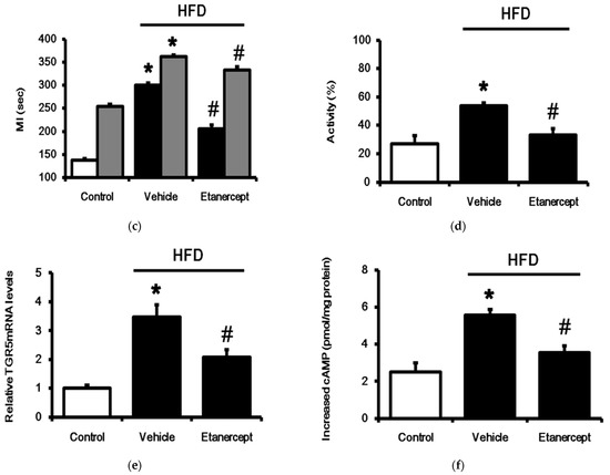 Changes in the urinary bladder of female rats. Female rats of three groups were used: (i) rats fed with normal chow (control); (ii) HFD-fed rats treated with vehicle (HFD); (iii) etanercept-treated rats that received HFD (HFD + etanercept). Basic contractility in each group, as seen from the cystometrogram, was compared (a). TGR5 activated by betulinic acid (50 mg/kg, ip) or not (vehicle) for changes in voiding contraction (b) and micturition frequency (c) among the three groups, as seen from the cystometrogram, were also compared. The voiding contraction decreased by betulinic acid, calculated as the ratio (%) of the non-treated contraction, was indicated as the activity of betulinic acid for a comparison among the three groups (d). The results in each column are indicated as the mean ± SEM (n = 8 per group). Additionally, changes in the mRNA levels of TGR5 expression in isolated urinary bladders of each group were compared (e). Increased cAMP levels by betulinic acid (5 µM) through TGR5 activation were also compared among the three groups (f). The results in each column are indicated as the mean ± SEM (n = 4 per group). * p < 0.05 vs. the control group; # p < 0.05 vs. the vehicle-treated group.