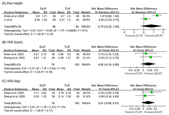 To analyze the changes in disc height, the random effect model was used (I2 = 91%). The increase in disc height after OLIF was larger than that after TLIF (SMD = 0.79, 95% CI = −0.35 to 1.93), but there was no significant difference (Figure 2). To determine the change in the degrees of pain in the back and leg, measured using the VAS, the fixed effect model was used (VAS (back): I2 = 0%; VAS (leg): I2 = 0%). The changes in VAS score for both back and leg were not significantly different between the two surgical operations (VAS (back): SMD = 0.20, 95% CI = −0.10 to 0.50; VAS (leg): SMD = 0.21, 95% CI = −0.09 to 0.51).