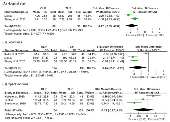 For analyzing hospital stay and blood loss during surgical operation, the random effect model was used (hospital stay: I2 = 79%; blood loss: I2 = 94%) (Figure 3). OLIF resulted in shorter length of hospital stay and less blood loss than TLIF (hospital stay: SMD = −1.77, 95% CI = −2.63 to −0.92; blood loss: SMD = −1.44, 95% CI = −2.61 to −0.28). However, the results on operation time were not significantly different between OLIF and TLIF (I2 = 84%, random effect model, SMD = −0.21, 95% CI = −0.87 to 0.45).