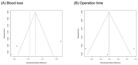 A funnel plot analysis and Egger’s test were performed for blood loss and operation time (Figure 4). All the p-values for the Egger’s test were > 0.05 (blood loss: p = 0.358; operation time: p = 0.983). Therefore, the publication bias was not significant.