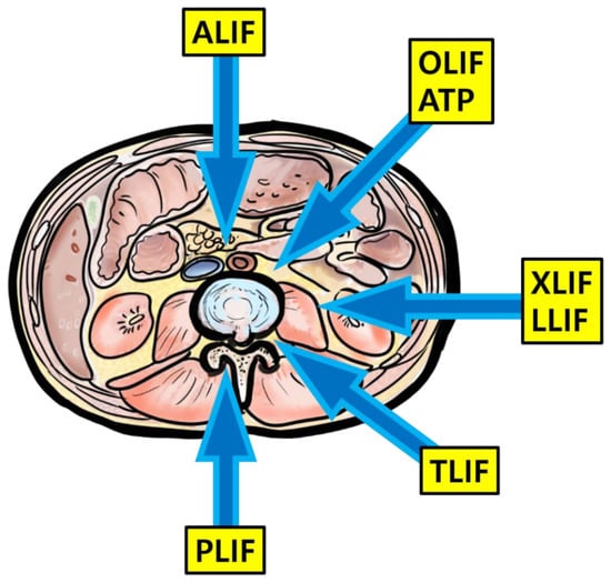 - Allain, J.; Dufour, T. Anterior lumbar fusion techniques: ALIF, OLIF, DLIF, LLIF, IXLIF. Orthop. Traumatol. Surg. Res. 2020, 106, S149–S157. [Google Scholar] [CrossRef]