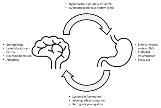 Although the link between gut dysbiosis and neurological disorders remains speculative, anatomical evidence can now provide a clearer perspective of the bilateral communications between the gut and the brain. The microbiota–gut–brain axis is a recent description of a complex relationship between the gut epithelia, its associated microbes, and the brain. The central nervous system (CNS) and the enteric nervous system (ENS) are comprised of two terminal nodes, and the autonomic nervous system (ANS), sensory nerves, and the hypothalamic–pituitary–adrenal (HPA) axis serve as the edges that connect between the two nodes (Figure 1). In short, two major forms of communication routes are proposed to have facilitated microbial-associated pathogenesis of neurodegenerative disorders—the direct trans-neuronal route and blood transport through the systemic circulation. In the former, small infectious agents such as viruses can infect the cells and directly reach the brain through anterograde or retrograde transmissions. Other microbes can also induce or release prion-like proteins that can propagate along peripheral nerves to reach the brain. In the latter, microbial toxins and viruses can bypass intestinal epithelia, blood-brain barrier, and enters the brain through the systemic circulation. Viruses and toxins that successfully infiltrated into the systemic circulation can also cause inflammation at the local or systemic levels, leading to subsequent neuronal excitotoxicity, leaky blood-brain barrier, inflammation, and eventually cellular atrophy. In turn, the brain can also respond to these signals and influence the gut back through the ANS, ENS, or HPA pathways, either by direct neuronal stimulation or through the systemic release of hormones [5]. A comprehensive review of the relationship between the HPA, ANS, gut microbiome, and neurodegeneration was recently discussed by Peterson (2020) and Giordano (2020) [6,7].