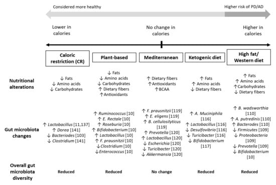 With such complex microbe–microbe, host–microbe, drug–microbe, and drug–host interactions, it is difficult to pinpoint specific dietary elements or strict dieting regimens that may help prevent or ameliorate AD and PD progression. Nevertheless, a few dietary risk factors are prominent. High salt, high fat, and high sugar diets, such as the WD, subjects the patient to inflammation at the gut level and are positively associated with hypercholesterolemia and hypertension. On the other hand, restrictive diets such as CR, plant-based diets, and KD may contain higher amounts of dietary fibers, antioxidants, polyphenols, and ketone bodies, and have been reported to have anti-inflammatory properties, help to reduce oxidative stress, and facilitate smoother bowel motion. Interestingly, AD patients show better outcomes with treatments that decrease gut microbe diversity. Therefore, long-term CR and a plant-based diets that reduce gut biodiversity would likely be beneficial for AD patients. In contrast, a treatment that increases gut biodiversity in PD patients often appears to ameliorate gut dysbiosis and promote better peristaltic bowel movements. FMT treatment with a well-balanced diet and a high dietary content, therefore, seems more promising for PD patients.