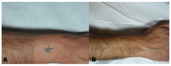 (A) Tattoo before treatment and (B) region after tattoo removal.