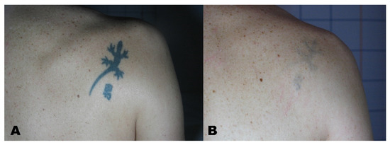 Tattooing, which involves creating a permanent skin pigmentation, has become a common phenomenon and a sign of individualism [1]. Individuals with tattoos sometimes seek the removal of tattoos for various reasons, becoming a more and more common request of patients in dermatological studies [2,3]. Although various methods have been proposed, such as surgery or chemical destruction, laser treatments are considered the most effective solution. Various lasers have been proposed to manage this condition. Traditionally, ablative lasers, such as CO2 lasers, are used [4].