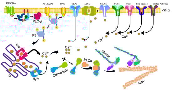 The intracellular free Ca2+ concentration ([Ca2+]i) is necessary to maintain basal vascular tone [8]. Increases in [Ca2+]i initiates VSM contraction [9]. The [Ca2+]i can be increased by triggering the Ca2+ influx. Depolarization of the cell membrane through voltage-dependent L-type Ca2+ channels (LTCCs), such as the opening of Cav1.2 channels in murine arterial myocytes or Cav1.3 channels in the canine basilar artery, is the primary means of Ca2+ entry into arterial smooth muscle [10,11,12]. Ca2+ leaks through non-specific Ca2+ movement across the plasma membrane; increases in intravascular pressure through stretch-activated Ca2+ channels could also activate voltage-dependent Ca2+ channels [13]. The opening of the Ca2+-activated chloride channels (CaCCs) can also lead to the depolarization of the membrane, followed by the opening of voltage-gated Ca2+ channels. Additionally, vasoconstrictor agonists enhance Ca2+ influx through transient receptor potential channels (TRPs), store-operated Ca2+ channels (SOCs) and receptor-operated nonselective cation channels (ROCs) [10,14,15,16,17,18].