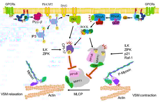 Three types of muscle tissues are found in vertebrates: skeletal muscle, cardiac muscle, and smooth muscle [1]. Muscle contraction depends on the ATP-driven sliding of highly organized arrays of actin filaments against arrays of myosin II filaments [2]. In smooth muscle, phosphorylation at Thr18/Ser19 of the myosin regulatory light chain results in myosin ATPase enzymatic activity that induces actin and myosin attachment to regulate smooth muscle contraction [3,4]. This process can be regulated by Ca2+-dependent and Ca2+-independent mechanisms [1,5,6,7]. The Ca2+-dependent signaling pathway acts mainly in combination with calmodulin (CaM) to form a complex that activates myosin light chain kinase (MLCK). In contrast, the Ca2+-independent signaling pathway acts mainly through the attenuation of myosin light chain phosphatase (MLCP) activity, i.e., Ca2+ sensitization. This review focuses on the two signaling pathways in vascular smooth muscle (VSM) contraction and the role of the Ca2+ sensitization pathway in hypertension.