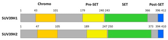 Scheme of the domain structure of human SUV39H1 and SUV39H2. The domain boundaries are indicated as listed in Uniprot.