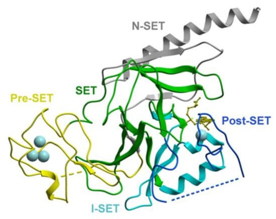 Structure of SUV39H2 in complex with AdoMet. The Pre-Set, SET, I-SET, Post-SET and N-SET domains are highlighted. The co-factor is shown as yellow sticks. Residues flanking un-resolved regions are connected by dotted lines. Taken from [19] with permission.