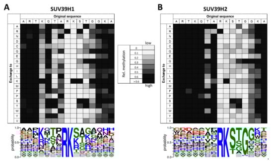Specificity profiles of SUV39H1 (A) and SUV39H2 (B). Methylation of peptide substrates containing all possible single amino acid exchanges of the H3 sequence is shown. The horizontal axis represents the sequence of the peptide and in the vertical direction the amino acid that is altered in the corresponding peptide is indicated. Activity is encoded in a grayscale as indicated in the legend. The sequence logo describing the specificity has been prepared with Weblogo3 (http://weblogo.threeplusone.com/ (accessed on 30 April 2021)) [31] and is printed below. Activity data were taken from [26,28].