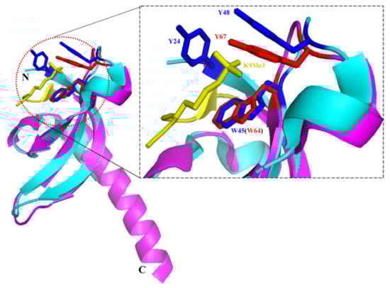 Model of H3K9me3 binding by human SUV39H1 chromodomain. The structures of human SUV39H1 and Drosophila melanogaster HP1 (PDB: 1KNE) chromodomains are aligned and shown in magenta and cyan, respectively [22]. The Y24, W45 and Y48 residues of Drosophila melanogaster HP1 chromodomain that are critical for H3K9me3 binding are shown as sticks in blue. The corresponding residues W64 and Y67 of human SUV39H1 chromodomain are shown as sticks in red. The H3K9me3 peptide present in the Drosophila melanogaster HP1 chromodomain is shown in yellow with trimethylated lysine 9 shown as sticks. Taken from [22] with permission.