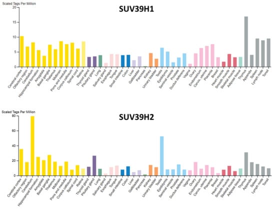 Expression of SUV39H1 and SUV39H2 in human tissues. Data were taken from https://www.proteinatlas.org/ (accessed on 30 April 2021) [53] using the FANTOM5 data set. Data are reported as Scaled Tags per million. Color-coding is based on tissue groups, each consisting of tissues with functional features in common.