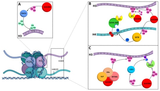 Compilation of the SUV39H centered chromatin network including interacting proteins and complex partners, histone methylation sites and non-histone substrates of SUV39H1 and SUV39H2. The upper left insert (A) illustrates SUV39H1 methylation of Dot1L, which itself methylates H3K79. The upper right insert (B) shows methylation of H3K9 by SUV39H. This is followed by recruitment of SUV39H and SUV4-20H by HP1 proteins to the H3K9me2/3 sites, leading to the spreading of H3K9me3 and introduction of H4K20me2/3 at H4K20me1 sites. Generation of H4K20me1 by SET8 is stimulated by SUV39H1 mediated methylation. The lower right insert (C) features the role of SUV39H in H3K9 methylation as members of the complex of SUV39H with G9a, GPL and SETDB1 PKMTs. SUV39H methylation of the LSD1 (SUV39H2) and RAG2 (SUV39H1) non-histone substrates is shown, which are creating a crosstalk with H3K4 methylation. LSD1 has a role in the removal of H3K4me1/2 and RAG2 is a reader of H3K4me3.