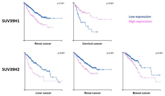 Cancer connection of SUV39H1 and SUV39H2. Kaplan–Meier plots are shown for cancers where high expression of SUV39H1 or SUV39H2 has significant (p < 0.001) association with patient survival. Data were retrieved at https://www.proteinatlas.org (accessed on 30 April 2021) [53].