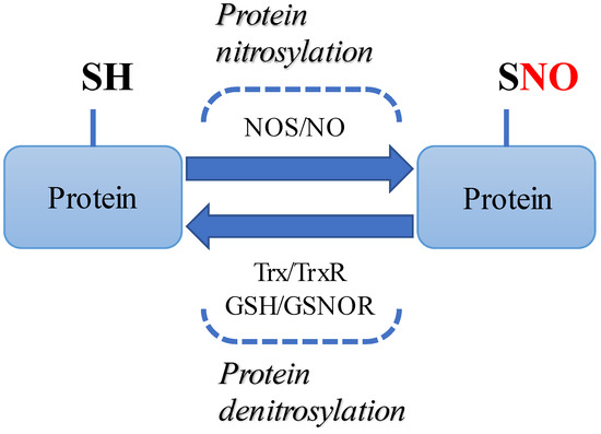 43]. The binding of NO groups to specific cysteine thiols of target proteins induces the formation of SNO proteins, thereby regulating protein function [