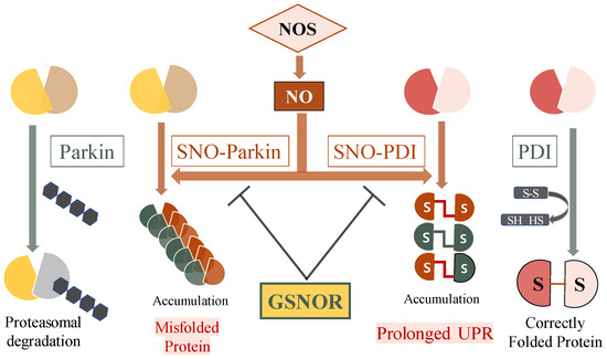 This review focuses on specific examples demonstrating the important role of S-nitrosylation of E3-ubiquitin-protein ligase (e.g., Parkin) and endoplasmic reticulum chaperone (e.g., protein disulfide isomerase (PDI)), which contribute to the accumulation of misfolded proteins [