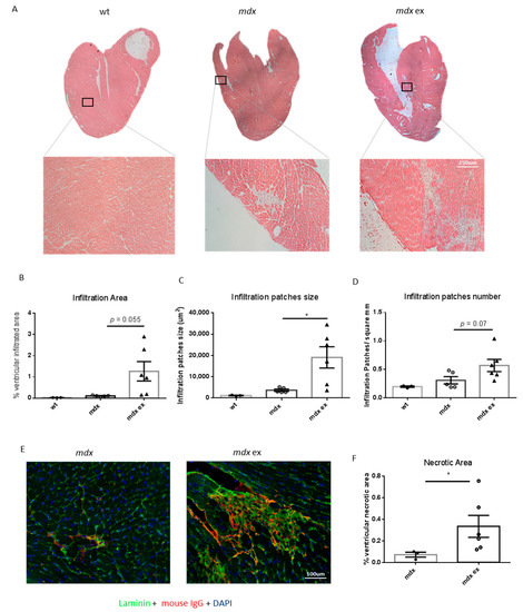To assess cardiac muscle organization, heart ventricles cryosections were stained with hematoxylin and eosin (H&E). We found no obvious alterations in cardiac muscle tissue organization in exercised mdx compared with age-matched wild-type or mdx mice; however, a slight increase in cell infiltration area was observed, although this increase did not reach statistical significance (Figure 4A,B). Interestingly, cell infiltration patches were both higher in number and bigger in size in the heart of exercised mdx mice compared to unexercised controls (Figure 4C,D). Immune cell infiltration of the dystrophic heart is often triggered by the necrotic cell death of cardiomyocytes [43], and fibrotic tissue deposition usually follows muscle cell death in both dystrophic skeletal and cardiac muscle [44]. We therefore analyzed cardiomyocyte necrosis after the exercise protocol. Interestingly, there was a significant increase in the ventricular necrotic area in exercised mdx heart compared to unexercised controls, as shown by immunofluorescence analysis using an anti-mouse IgG antibody (Figure 4E,F). Taken together, these results demonstrate that the exercise protocol worsens the dystrophic heart phenotype in terms of increased cell infiltration and cardiomyocytes necrosis.