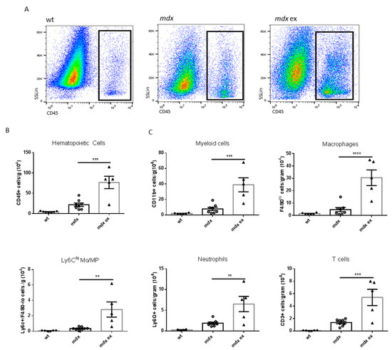 Cytofluorimetric analysis of the immune population isolated from wild-type, exercised mdx, and control mdx hearts: (A) representative images showing the gating for CD45+ infiltrating cells in wild-type exercised and control mdx hearts, after excluding debris, doublets, and dead cells. (B) Quantification of total hematopoietic cells infiltrating wild-type, exercised mdx, and control mdx hearts, identified as CD45 positive and expressed as number of cells normalized per gram of tissue. (C) Quantification of the immune subpopulation infiltrating the heart of wild-type, exercised mdx, and control mdx mice, expressed as number of cells normalized per gram of tissue. The cell populations were identified as indicated: total myeloid cells as CD11b+, macrophages as Ly6c-/F4/80hi, freshly recruited monocytes as Ly6chi/F4/80-, neutrophils as Ly6g+, and T cells as CD3+. Data are shown as mean ± S.E.M., n = 6/8/5 independent samples. ** = p < 0.01, *** = p < 0.01, **** = p < 0.0001, ordinary one-way ANOVA with Bonferroni correction for multiple comparisons.