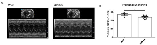 Echocardiographic analysis of left ventricle fractional shortening in exercised and control mdx: (A) representative images of the echocardiographic analysis of exercised and control mdx hearts, as indicated. (B) Left ventricle fractional shortening expressed as percentage and calculated on the short axe. Data are shown as mean ± S.E.M., n = 6/7 independent samples; * = p < 0.05, unpaired t-test w/Welch’s correction.