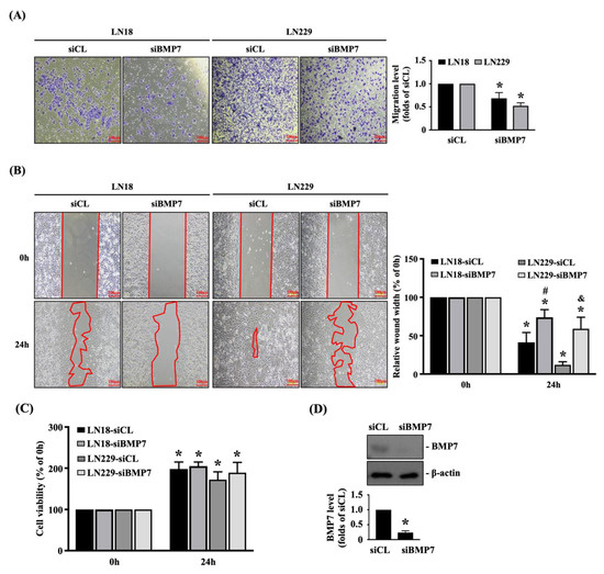 Endogenous BMP7 affects human LN18/LN229 glioblastoma cell transmigration and migration. Human LN18 and LN229 glioblastoma cells were transfected with control- or BMP7-specific siRNA and incubated for 48 h and then the (A) cell transmigration (transwell assay) and (B) migration capabilities (wound-healing assay), (C) cell viability (MTT assay), and (D) BMP7 expression (Western blot) were determined. Results in (A–D) are representative of three independent experiments with similar results. Statistic data in (A–D) are mean ± SEM from three independent experiments. (A–D) *, p < 0.05 vs. siCL group (A,D) and siCL-0 h/siBMP7-0 h group (B,C). (B) #, p < 0.05 vs. siCL-24 h group in LN18 cells; &, p < 0.05 vs. siCL-24 h group in LN229 cells. Scale bars in (A,B) are 100 μm.