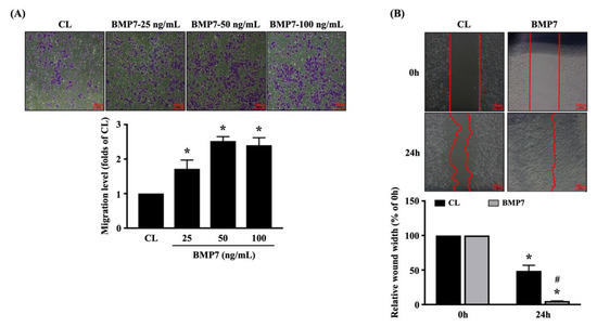 Human LN18 glioblastoma cells were kept as the controls or treated with BMP7 (25, 50, and 100 ng/mL) for 24 h and then the transmigration capability of cells was determined by the transwell assay. BMP7 at 25 and 50 ng/mL significantly increased the transmigration level of human LN18 glioblastoma cells in a dose-dependent manner compared to the untreated controls (Figure 3A). The increase in human LN18 glioblastoma cell transmigration level of 100 ng/mL BMP7 stimulation slightly declined compared to the 50 ng/mL BMP7-treated cells, but it still higher than the untreated controls (Figure 3A). Cells were kept as the controls or treated with 50 ng/mL BMP7 for 0 and 24 h and then the migration capability was determined by the wound-healing assay. It was shown that BMP7 could accelerate the human LN18 glioblastoma cell migration after 24 h of treatment (Figure 3B).