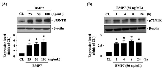 BMP7 increases p75NTR expression in human LN18 glioblastoma cells. (A,B) Human LN18 glioblastoma cells were kept as the controls or treated with BMP7 (25, 50, 100 ng/mL) for 8 h (A) or treated BMP7 (50 ng/mL) for 1, 4, 8, and 24 h (B) and then the p75NTR protein expression was determined by Western blot. Results in (A,B) are representative of three independent experiments with similar results. Statistic data in (A,B) are mean ± SEM from three independent experiments. *, p < 0.05 vs. CL group.
