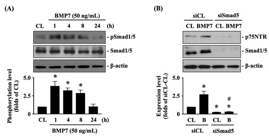 Smad5 regulates p75NTR expression in BMP7-stimulated human LN18 glioblastoma cells. (A) Human LN18 glioblastoma cells were kept as the controls or treated with BMP7 (50 ng/mL) for 1, 4, 8, and 24 h and then the Smad1/5 phosphorylation was determined by Western blot. (B) Human LN18 glioblastoma cells were transfected with control-, Smad1- or Smad5-specific siRNA, kept as the controls or treated with BMP7 (50 ng/mL) for 24 h and then the p75NTR protein expressions were determined by Western blot. Results in (A,B) are representative of three independent experiments with similar results. Statistic data in (A,B) are mean ± SEM from three independent experiments. (A) *, p < 0.05 vs. CL group. (B) *, p < 0.05 vs. siCL-CL group; #, p < 0.05 vs. siSmad5-CL group.