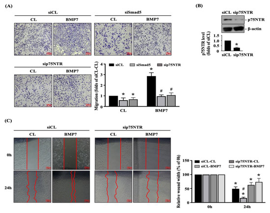 Smad5-p75NTR signaling regulates BMP7-promoted human LN18 glioblastoma cell transmigration and migration. Human LN18 glioblastoma cells were transfected with control-, Smad5- or p75NTR-specific siRNA and then kept as the controls or treated with BMP7 (50 ng/mL) for 24 h. (A–C) The transmigration capabilities (A), p75NTR expression (B), and migration capabilities (C) of human LN18 glioblastoma cells were determined by the transwell assay, Western blot, and wound-healing assay, respectively. (A) *, p < 0.05 vs. siCL-CL group. #, p < 0.05 vs. siCL-BMP7 group. (B) *, p < 0.05 vs. siCL group. (C) *, p < 0.05 vs. 0 h group. #, p < 0.05 vs. siCL-24 h group. Scale bars in (A,C) are 100 μm.