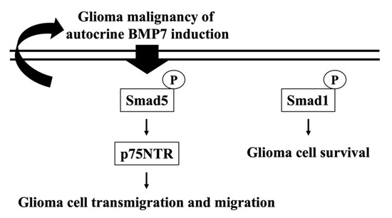 Glioblastoma is the most common malignant brain tumor with a poor prognosis. One of the major reasons for its therapy difficulty might be the presence of GICs [3,6]. GICs have high self-renewal, propagation, and tumor initiation characteristics. These lead to the relapse occurrence after treating by chemotherapeutic drugs and/or radiotherapy [1,3,5,6]. GICs have been found having the neuron stem cell-like property. Thus, the growth factors, e.g., BMP4 and BMP7, which present and play a role in the neuron differentiation and development have been suggested to be of importance for glioma recurrence and these factors should be further investigated for future pharmaceutic targets [24,25]. Recently, in addition to the tumorigenicity inhibitory activity, BMP7 has been found as another interesting role in the glioblastoma invasion promotion [13]. Based on this interesting finding, the present study further found that the endogenous and exogenous BMP7 stimulations indeed have an important role to promote the transmigration and migration capabilities of glioblastoma in human LN18/LN229 glioblastoma cells through Smad5-p75NTR pathway (summarized in Figure 7). The systematic experiments demonstrated that (i) a higher BMP7/pSmad5 level is found in the human malignant glioma tissues compared to the healthy brain tissues; (ii) BMP7 promotes human LN18/LN229 glioblastoma cell transmigration and migration through autocrine stimulation; (iii) Smad5 increases the p75NTR level to regulate the BMP7 effect on human LN18 glioblastoma cell transmigration and migration; (iv) Smad1 gene knockdown in human LN18 glioblastoma cells directly initiate their cell death.