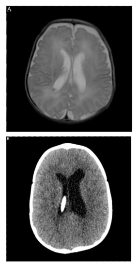 At 1 month of age, bilateral dilation of the ventricles was noted by routine premature examination of brain ultrasound. Brain magnetic resonance imaging (MRI) revealed grade 3 intraventricular hemorrhage (IVH) in the right lateral ventricle, with mild dilation of both lateral ventricles (Figure 1A) [11].