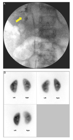 At 26 months of age, the patient visited an emergency department due to irritability caused by dysuria and lower abdominal pain. Urinary white blood cell (WBC) count and calcium to creatinine ratio (UCa/Cr) were slightly elevated by 4–9 per high-power field (HPF) and 0.36, respectively. Hematuria, ketonuria, glycosuria, and proteinuria were not observed, and the patient’s vital sign was stable. No elevation of serum WBC count and C-reactive protein level was observed. Thyroid function was stable (Table 1). Ultrasound revealed normal renal parenchyma with a mildly thickened bladder wall. The initial urine culture result was positive (105 colony-forming units per mL) for enteric Gram-negative rods, which were sensitive to aminoglycosides. Intravenous amikacin was continued for 4 days until the negative conversion. Dysuria was resolved, and the patient was discharged. At 35 months of age, the patient revisited the emergency department with the same complaints. Gross hematuria (urinary red blood cell counts > 100 per HPF) and elevated serum calcium level (10.7 mg/dL) were newly noted, while hypercalciuria progressed by a UCa/Cr of 0.79. Serum phosphorus, parathyroid hormone, and bone-specific alkaline phosphatase levels were normal. The patient’s urinary WBC count was 4–9 per HPF with no microorganism cultured. Voiding cystourethrography revealed grade 3 right vesicoureteral reflux, and 99mTc-dimercaptosuccinic acid cortical scan detected acute pyelonephritis (Figure 2A,B).