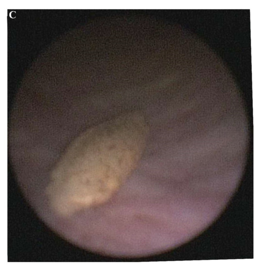 A cystoscope was introduced to examine the whole bladder, revealing a 1.7-cm-sized stone; therefore, endoscopic cystolitholapaxy was performed (Figure 2C). Endoscopic subureteral polydimethylsiloxane injection was performed for the management of right vesicoureteral reflux. The patient was discharged without postoperative complications, and no further episodes of hypercalciuria, pyuria, and dysuria were observed.