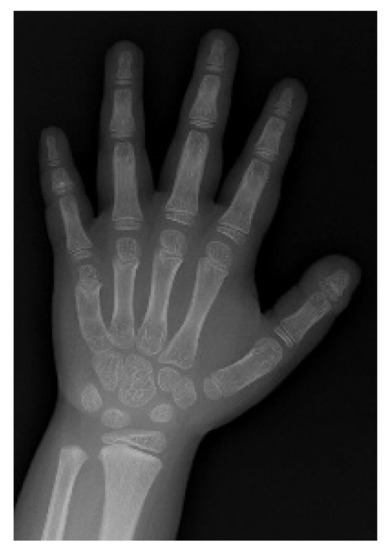 The patient was growing normally until 36 months of age, and his height and weight were consistently reaching above the 75th percentile starting 48 months of age. At 63 months of age, a 4-mL testicular volume and phallic enlargement were observed, while his height and weight were 115.2 cm (75–90th percentiles) and 21.7 kg (75–90th percentiles), respectively [12]. Café-au-lait spots were not observed. The patient’s bone age showed further acceleration when compared with previous radiographs at age of 12 months (Figure 3) [9].
