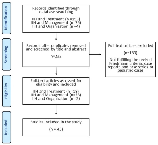 In total, we reached 237 articles. Only studies on adults and studies using the revised Friedman criteria (2013) were included and we excluded case reports and case series. Finally, 43 were suitable for the purpose of the study (Figure 1).