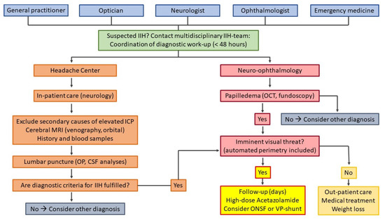 As the disorder is so complex and can be difficult to manage, a multimodal treatment strategy is needed and a dedicated team consisting of neurologists, neuro-ophthalmologists, neurosurgeons and dieticians are therefore recommended in most guidelines. The documentation for these multimodal structures is now evolving. By means of a structured follow-up protocol at 3, 6 and 12 months for IIH in the neuro-ophthalmological unit in a tertiary hospital in Spain the number of LPs was significantly reduced, the outcome was markedly improved. Thus, it was concluded that optimization of follow-up could lead to reduced use of resources and better care [53]. Likewise, in the long-term study the visual prognosis was very good after a regular and structured follow-up program in our dedicated neuro-ophthalmological team setting [51].