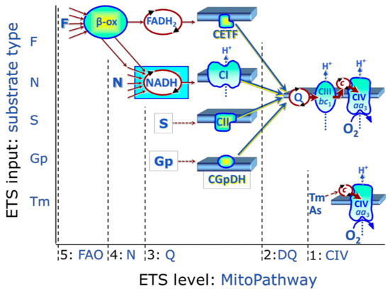 ET-substrate types are linked to ET-pathway types in substrate-uncoupler-inhibitor titration (SUIT) protocols. Electrons from multiple upstream origins feed into the Q junction. These origins include (5) fatty acid ß-oxidation (FAO) providing electrons from FADH2 to the electron-transferring flavoprotein complex (CETF; F pathway), (4) dehydrogenases and enzymes converging at the N-junction and providing electrons from NADH to complex I (N pathway), (3) succinate (S) providing electrons from FADH2 to Complex II (CII; S pathway). From the Q junction, electrons are then transferred to Complex III, cytochrome c and complex IV, before their transfer to O2 to form H2O. Figure from Gnaiger (2020) with permission [28]. Abbreviations: FADH2 = flavin adenine dinucleotide; NADH = Nicotinamide adenine dinucleotide.