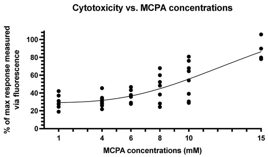 Regarding toxicity assays, data were analyzed by GraphPad Prism and a non-linear regression (sigmoidal, 4PL, least squares fit) was performed. For cell reduction potential, a non-linear regression (sigmoidal, 4PL, least squares fit) was also performed for each tested MCPA concentration at different times.
