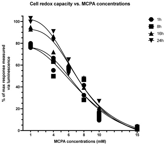 Regarding cell reducing potential, a non-linear regression (sigmoidal, 4PL, least squares fit) was also performed for each tested MCPA concentration at different times. Best-fit values indicated an IC50 of 8.09 ± 0.55 mM depending on the time recorded (Figure 3). In neither toxicity assay, HGA addition to cell cultures at concentrations ranging from 0.25 to 1 mM resulted in changes compared to control cells (data not shown). According to best-fit values, MCPA addition for subsequent experiments (i.e., HRR) was set at 9 mM.