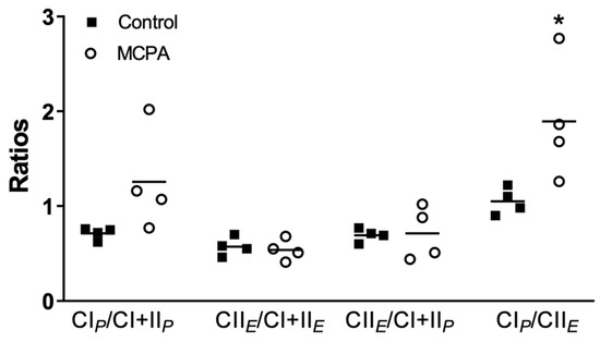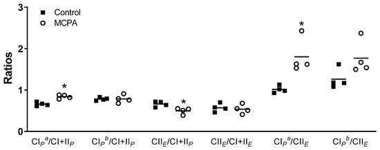 In SUIT2, significant differences between groups were also detected. Compared to the control cells, the MCPA treated cells showed an increase in the ratios of CIPa/CI + IIP and CIPa/CIIE and a decrease in the ratio CIIE/CI + IIP (Figure 5). Interestingly, the ratio CIP/CI + IIP was significantly different between groups when pyruvate and malate were used as substrates, but not when glutamate was added (Figure 5). The ratio of CII/CI + II was significant only when the denominator (CI + II) was taken under the P state, but not when it was taken under the E state (Figure 5).