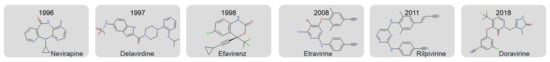 - De Clercq, E. The role of non-nucleoside reverse transcriptase inhibitors (NNRTIs) in the therapy of HIV-1 infection. Antivir. Res. 1998, 38, 153–179. [Google Scholar] [CrossRef]